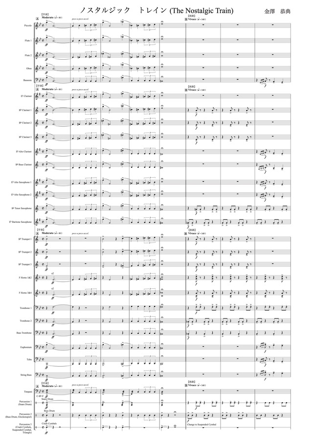 吹奏楽中〜大編成用の作品です。演奏時間は約6分、難易度は中程度です。 タイトルの「ノスタルジック トレイン」とは「懐かしの列車」を意味しています。時空 を超えて望郷の世界へと誘う「ノスタルジック トレイン」は少し古めの外観で、行き先は あなたの想い出の場所になります。 列車の出発をイメージした短い「序奏」で始まり、「旅路」では流れる風景、小刻みに震 える座席、列車が巻き上げる風等を表現しています。列車の目的地である「望郷」では故郷 を懐かしむ心象を表現し、「旅路 II」では、再び列車の描写に戻り軽快に次の目的地へと向 かいます。 <編成> Piccolo,2Flutes,Oboe,Bassoon,Clarinet in Eb,3Clarinets in Bb,Alto Clarinet,Bass Clarinet,2Alto Saxes.,Tenor Sax.,Baritone Sax.,3Trumpets,4Horns,3Trombones,Euphonium,Tuba,String Bass,Timpani,Snare Drum,Bass Drum,Crash Cymbals,Suspended Cymbal,Triangle,Glockenspiel ※ダウンロードファイルはスコア(24ページ)と全パート譜セットです。
