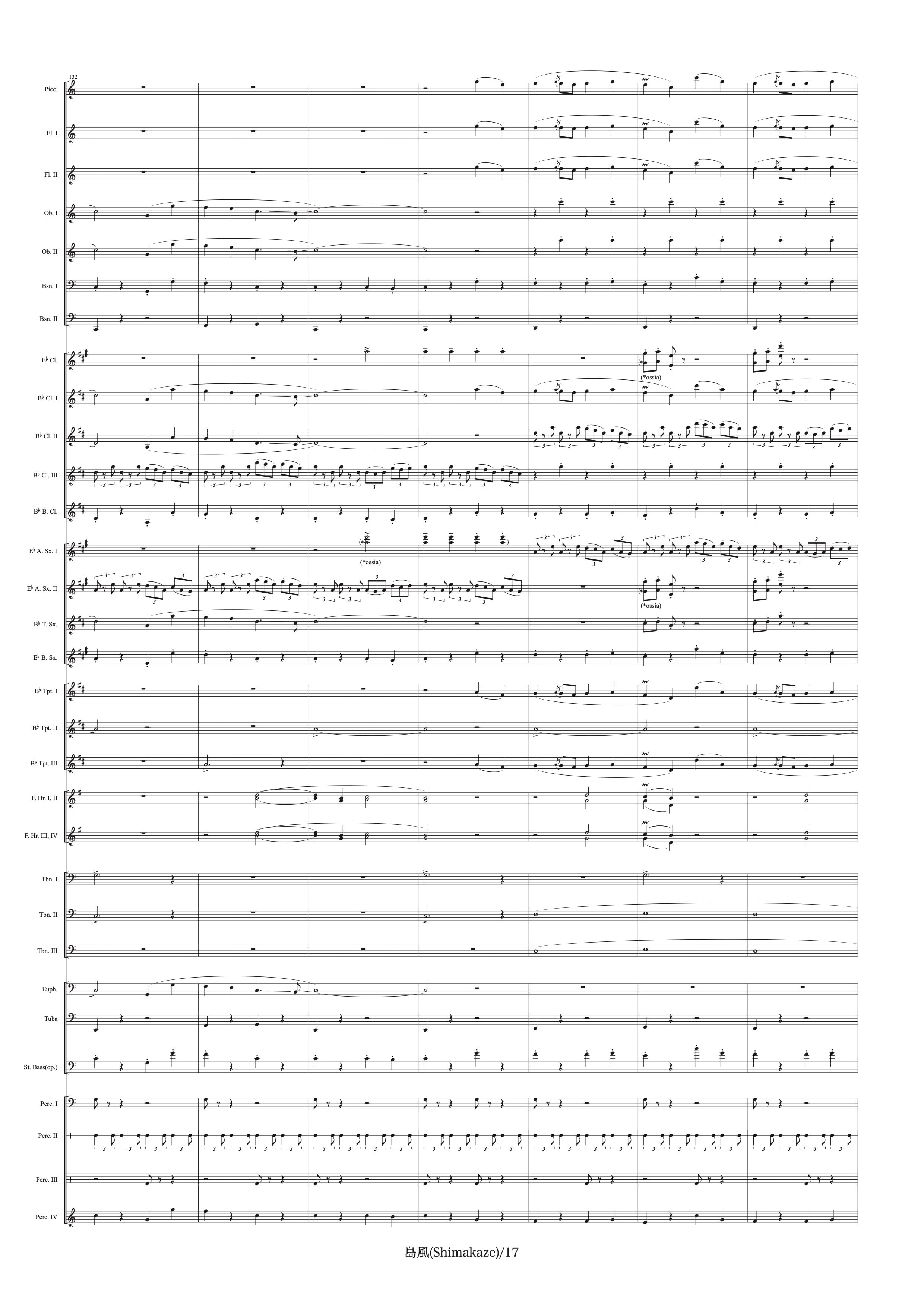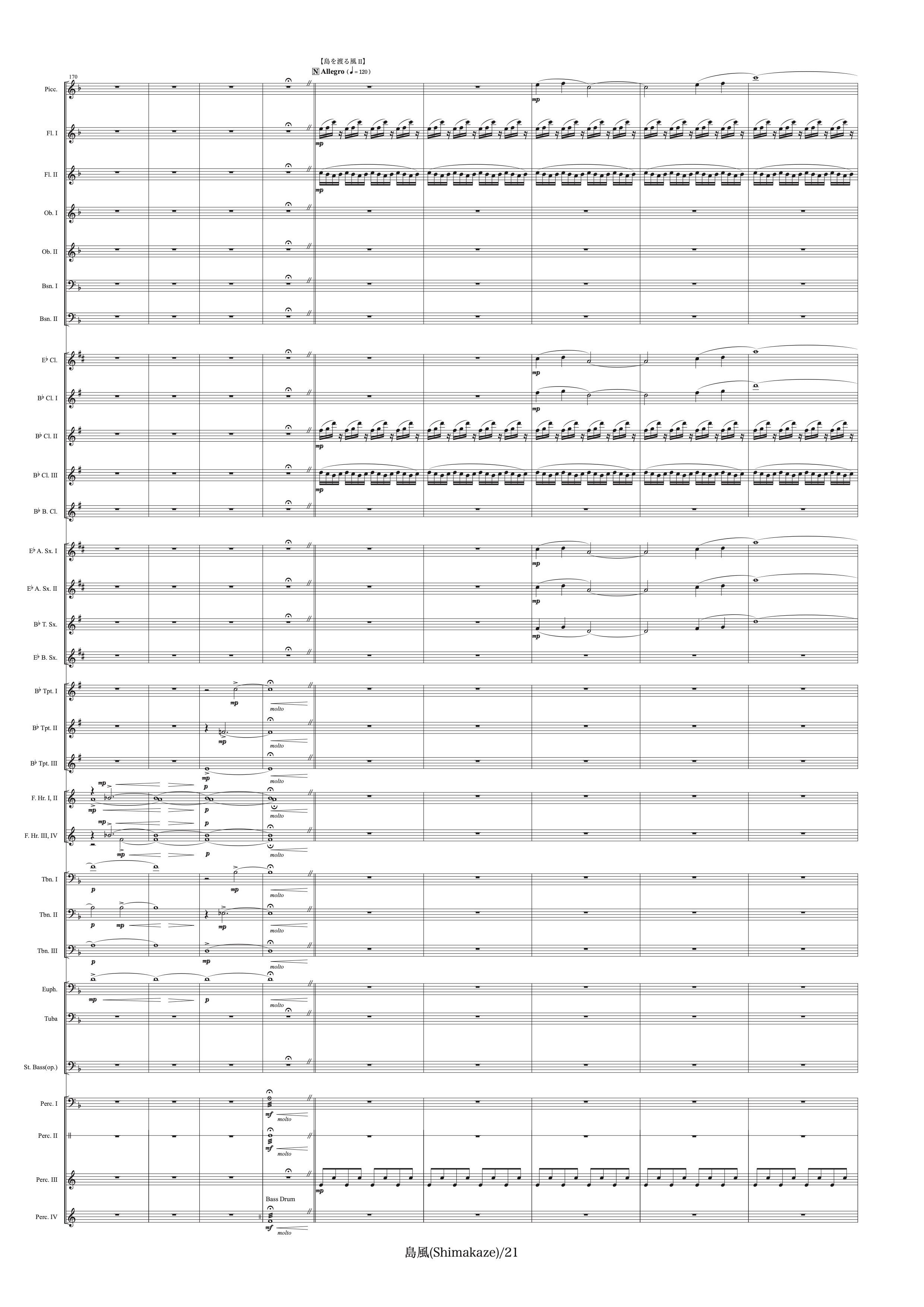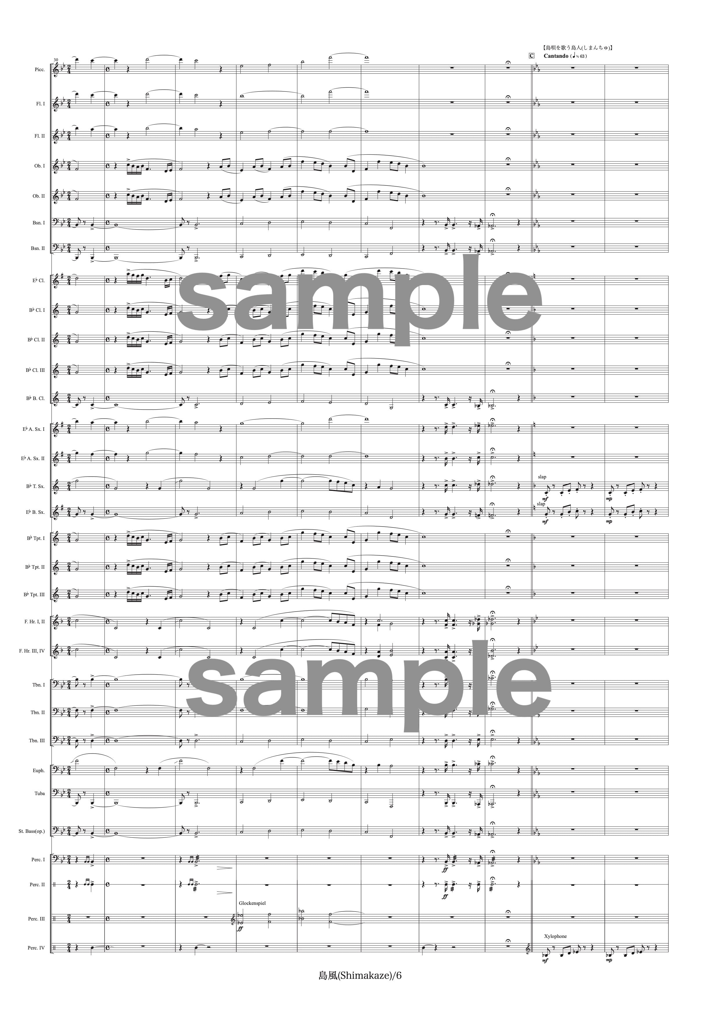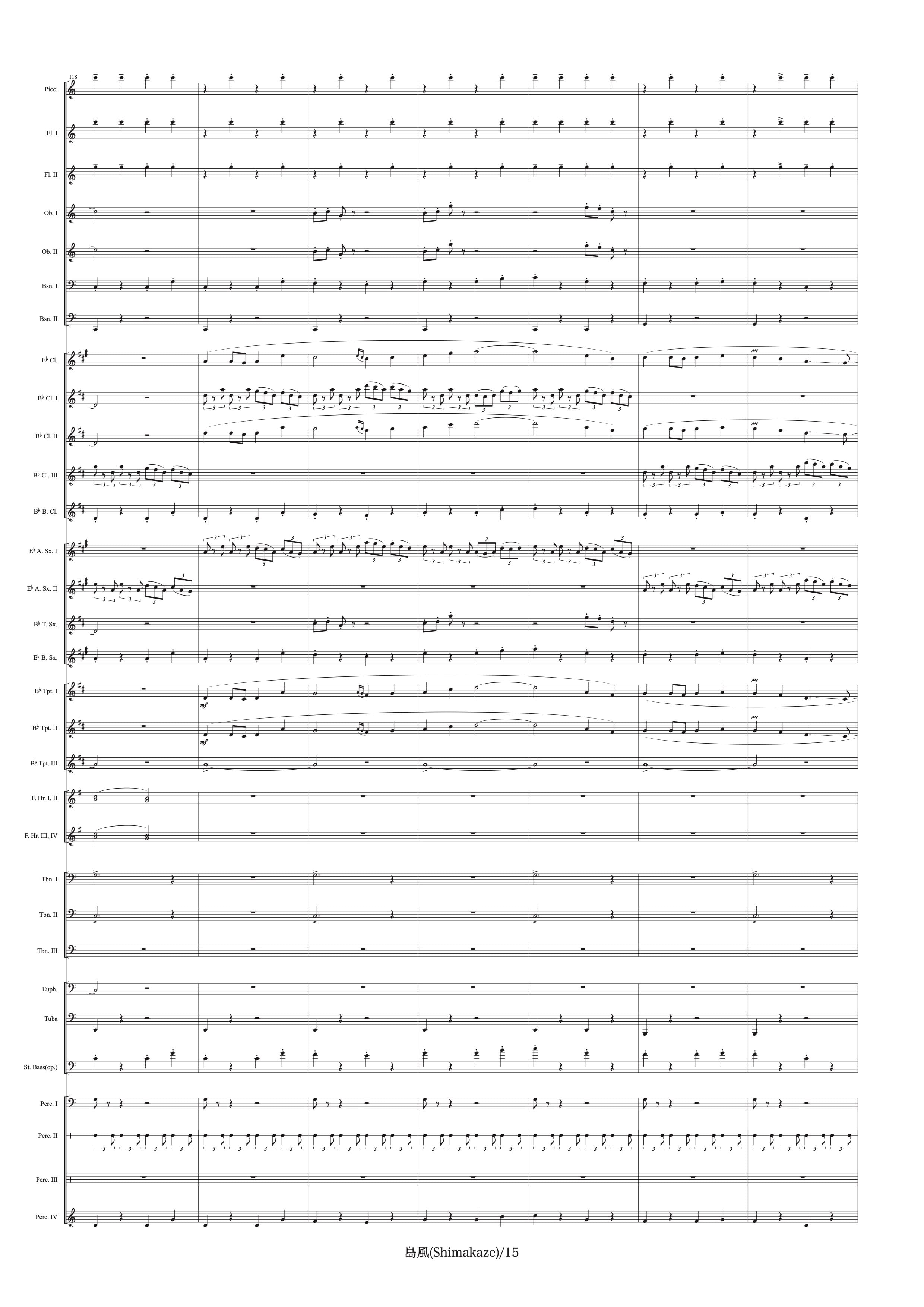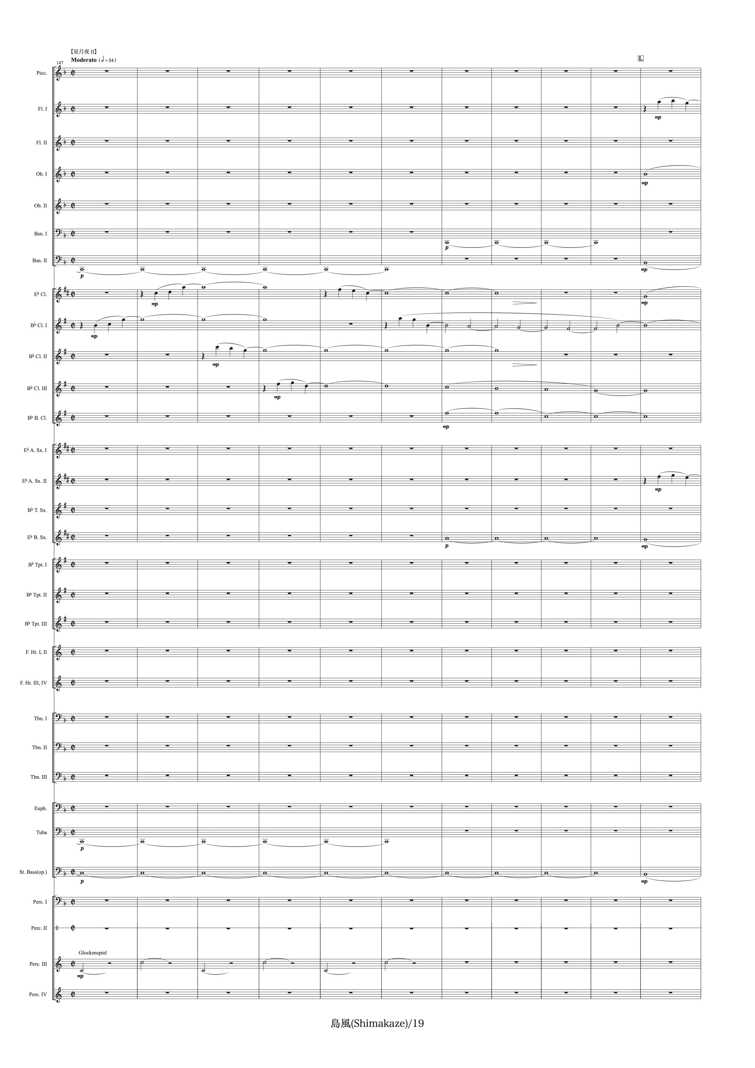 Piccolo,2Flutes,2Oboes,2Bassoons,Clarinet in Eb,3Clarinets in Bb,Bass Clarinet,2Alto Sax.,Tenor Sax.,Baritone Sax.,3Trumpets,4Horns,3Trombones,Euphonium,Tuba,String Bass(op.),Timpani,Snare Drum,Suspended Cymbal,Crash Cymbals,Bass Drum,Tom Tom,Glockenspiel,Xylophone