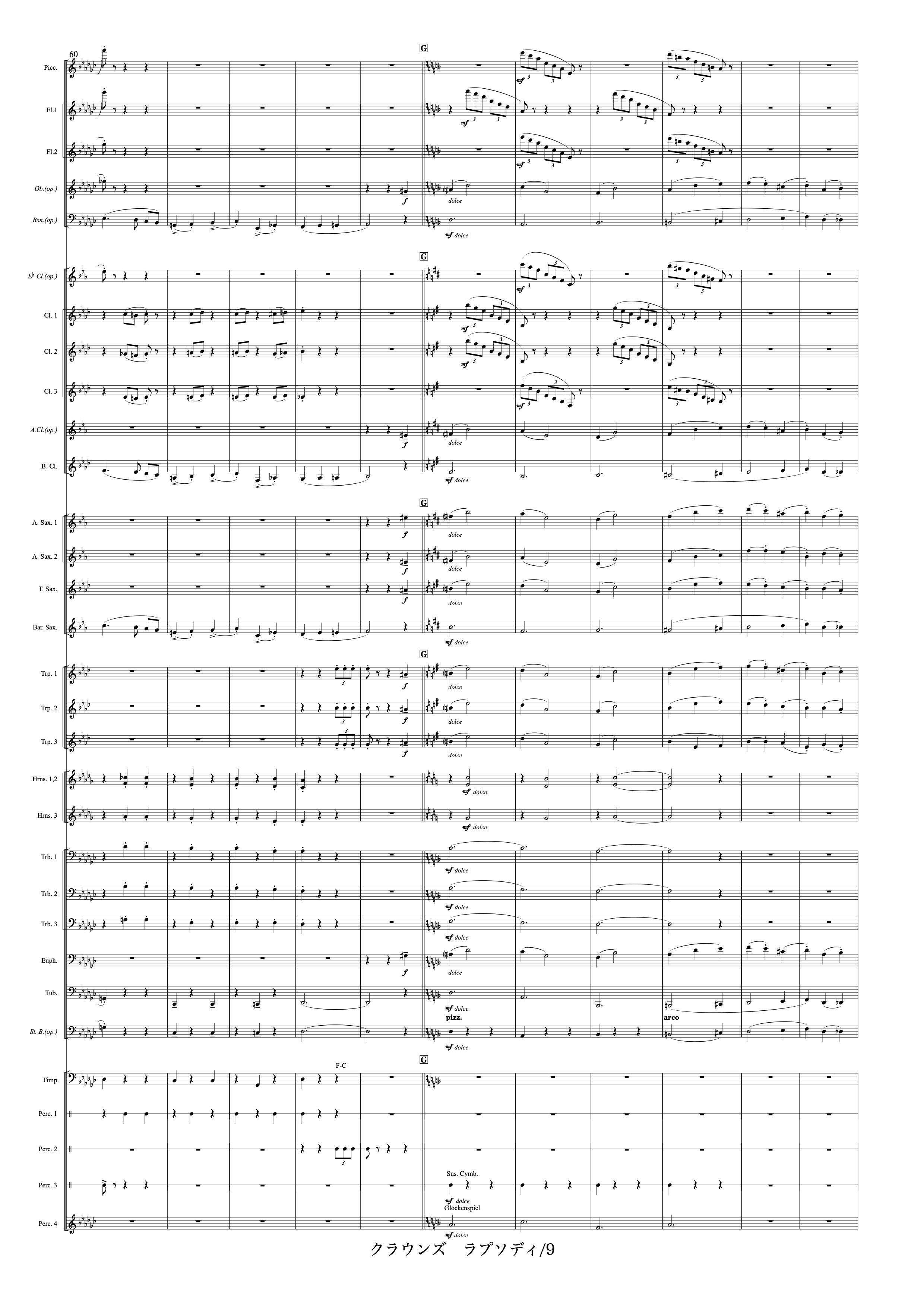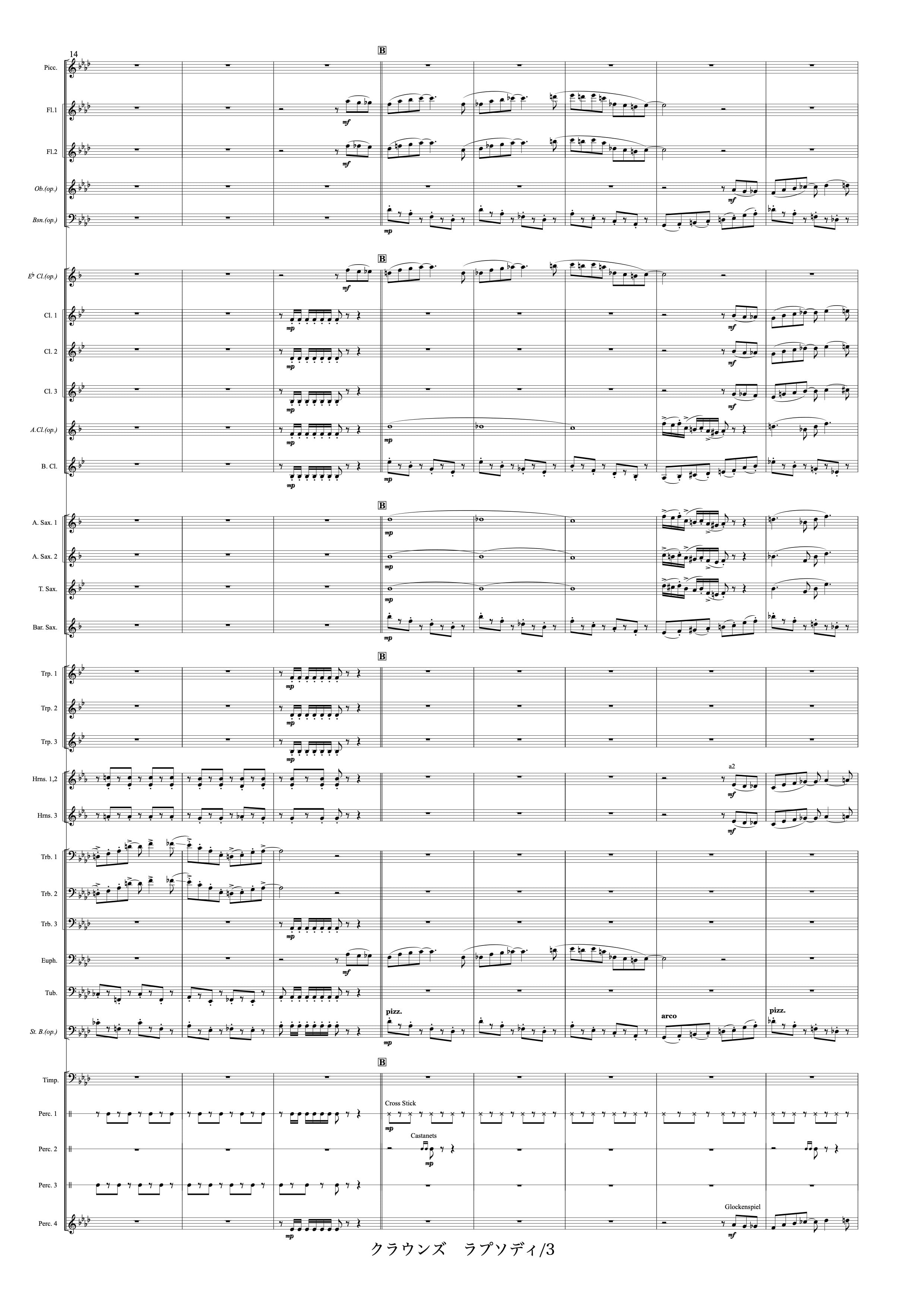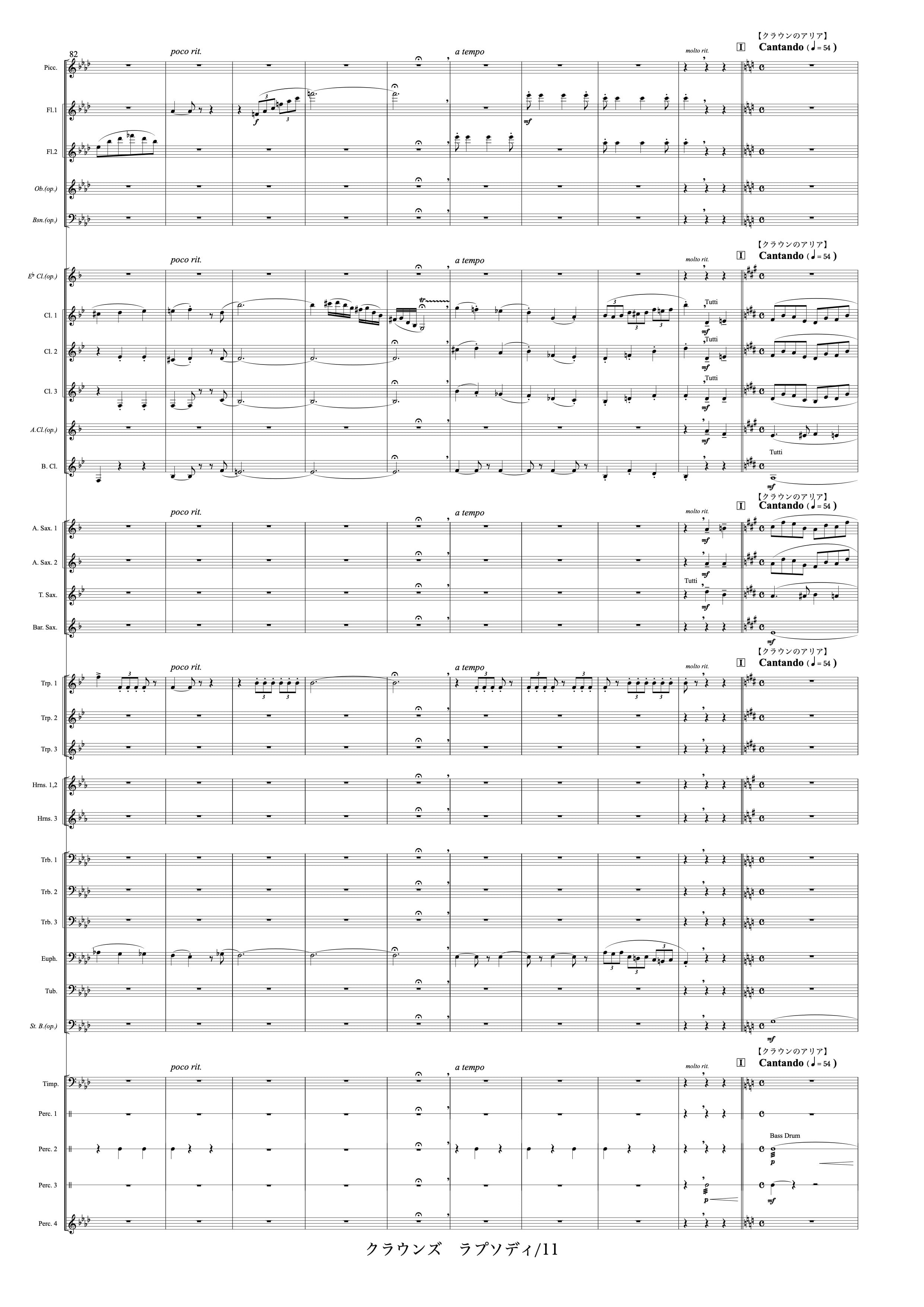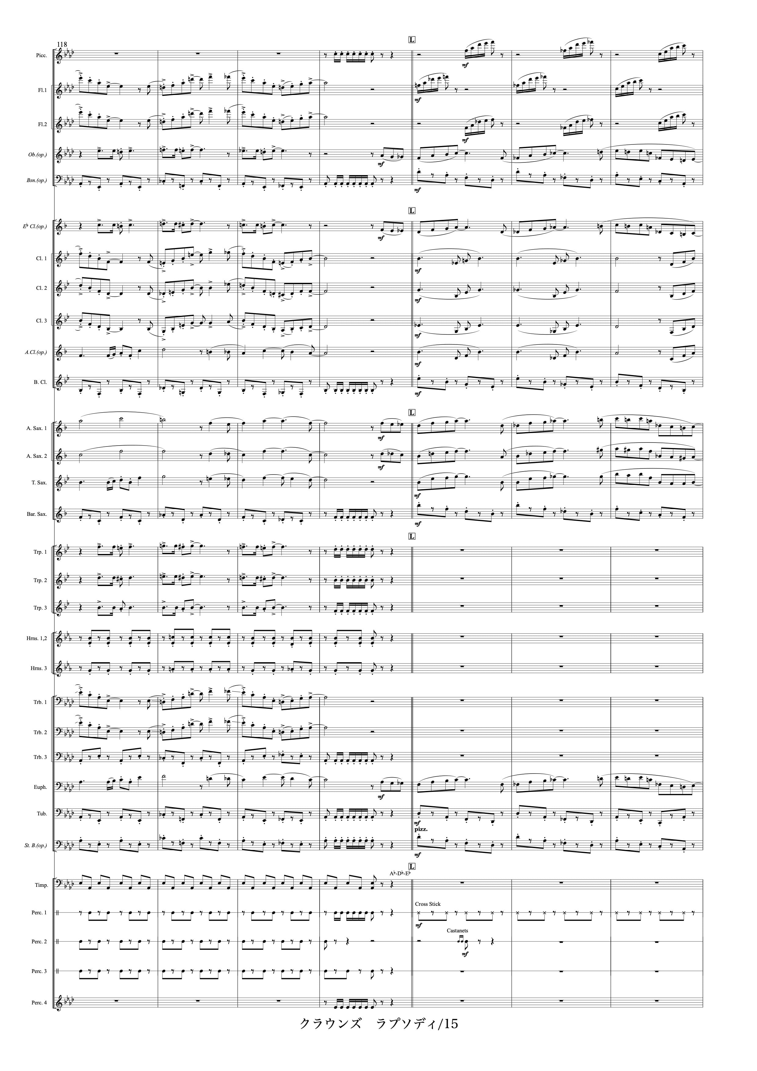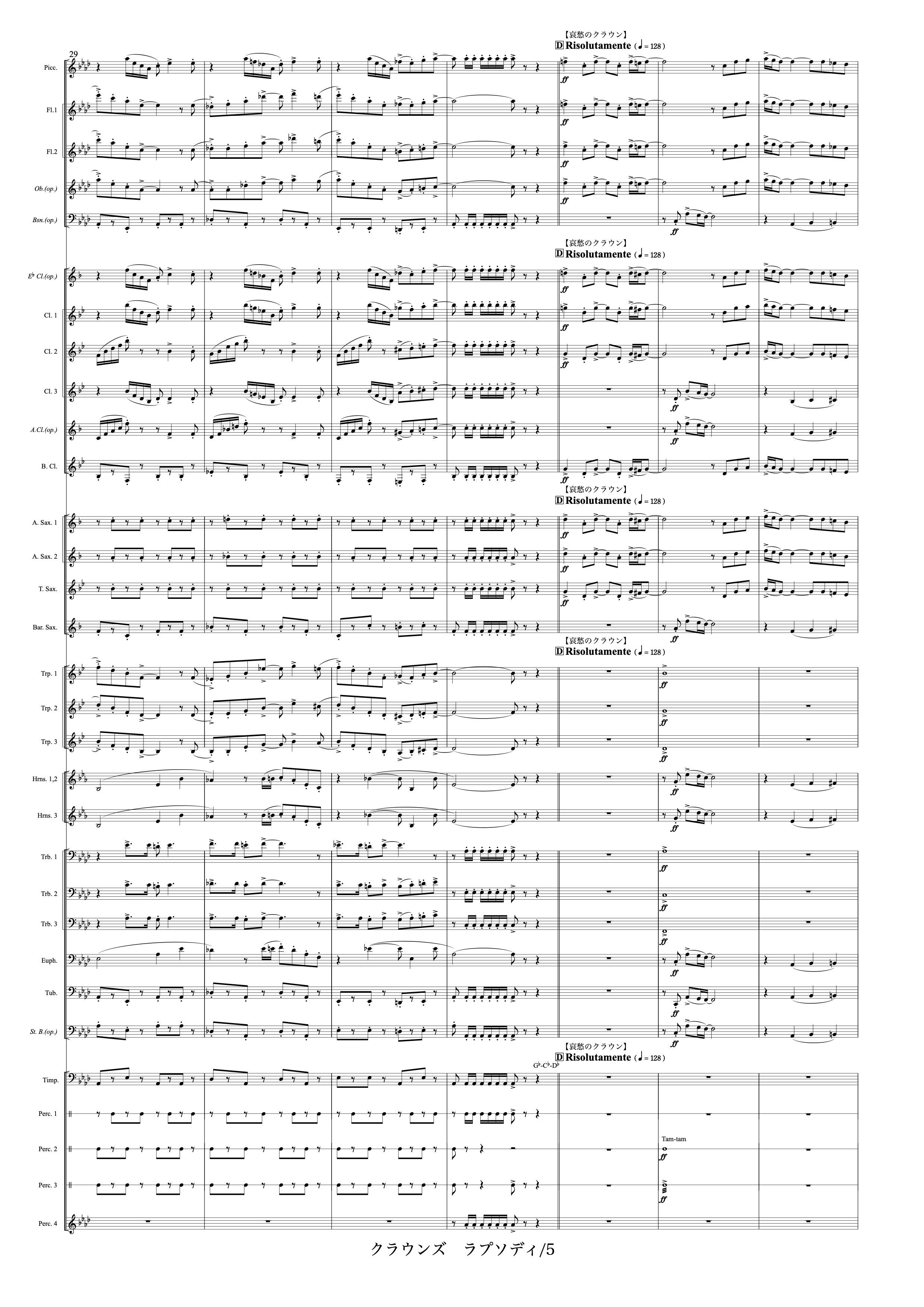 Piccolo,2Flutes,Oboe(op.),Bassoon(op.),Clarinet in Eb(op.),3Clarinets in Bb,Alto Clarinet(op.),Bass Clarinet,2Alto Sax.,Tenor Sax.,Baritone Sax.,3Trumpets,3Horns,3Trombones,Euphonium,Tuba,String Bass(op.),Timpani,Snare Drum,Castanets,Suspended Cymbal,Crash Cymbals,Bass Drum,Tam-tam,Glockenspiel,Xylophone
